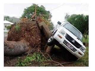 這場5級颶風將昆士蘭的路樹連根拔起,更吹得汽車東倒西歪。(圖/取自網路)
